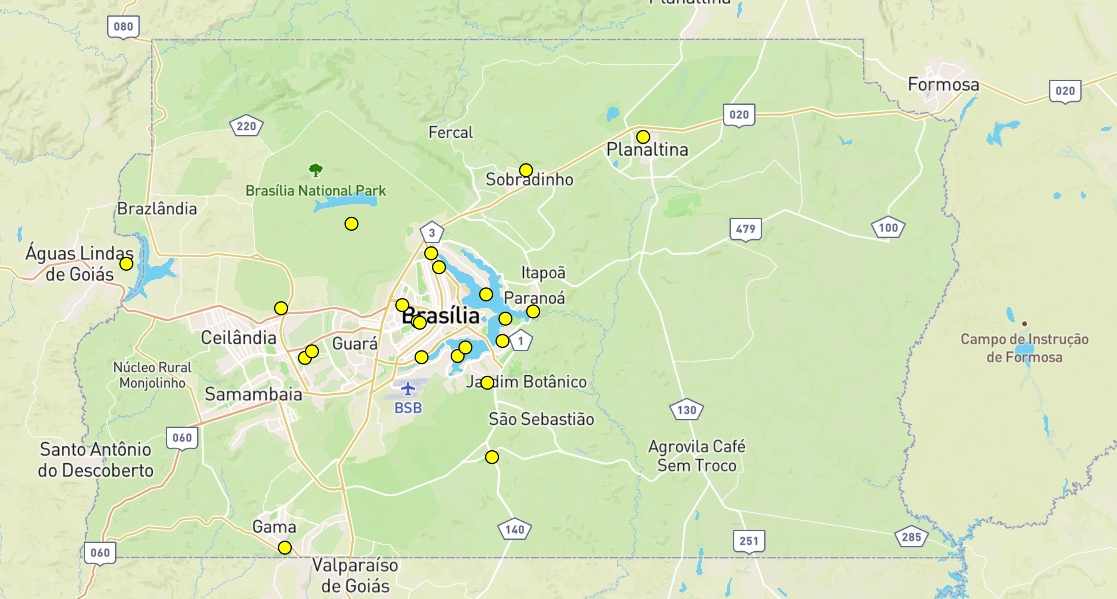 Cada Ponto Amarelo é um parque registrado no DF, acesse o mapa clicando aqui