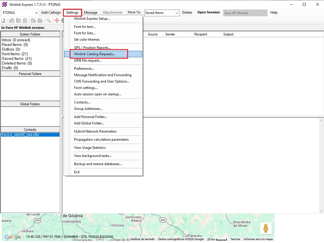 No menu principal do Winlink Express, selecione a opção Settings e, em seguida, Winlink Catalog Requests, como na imagem abaixo: